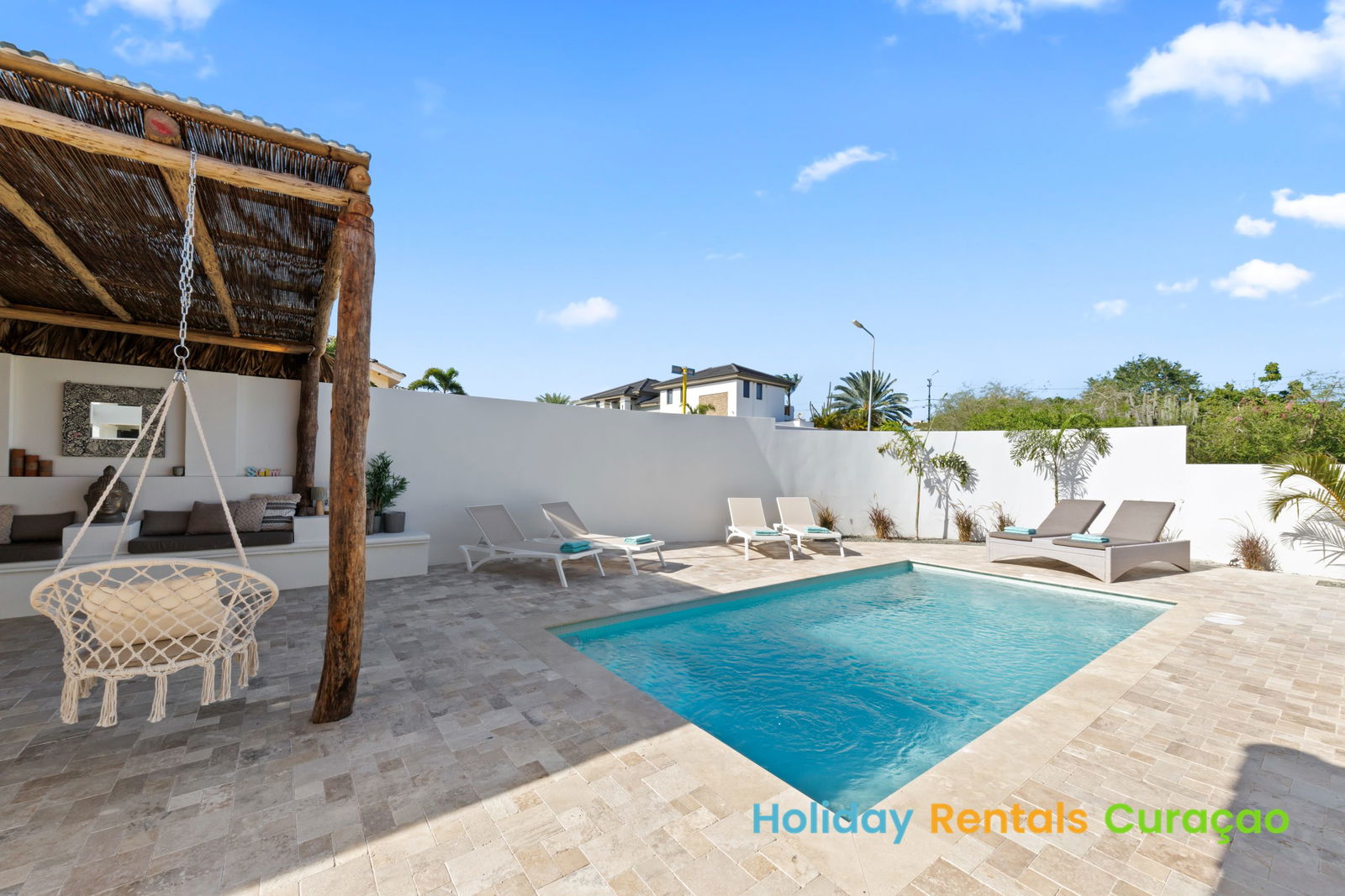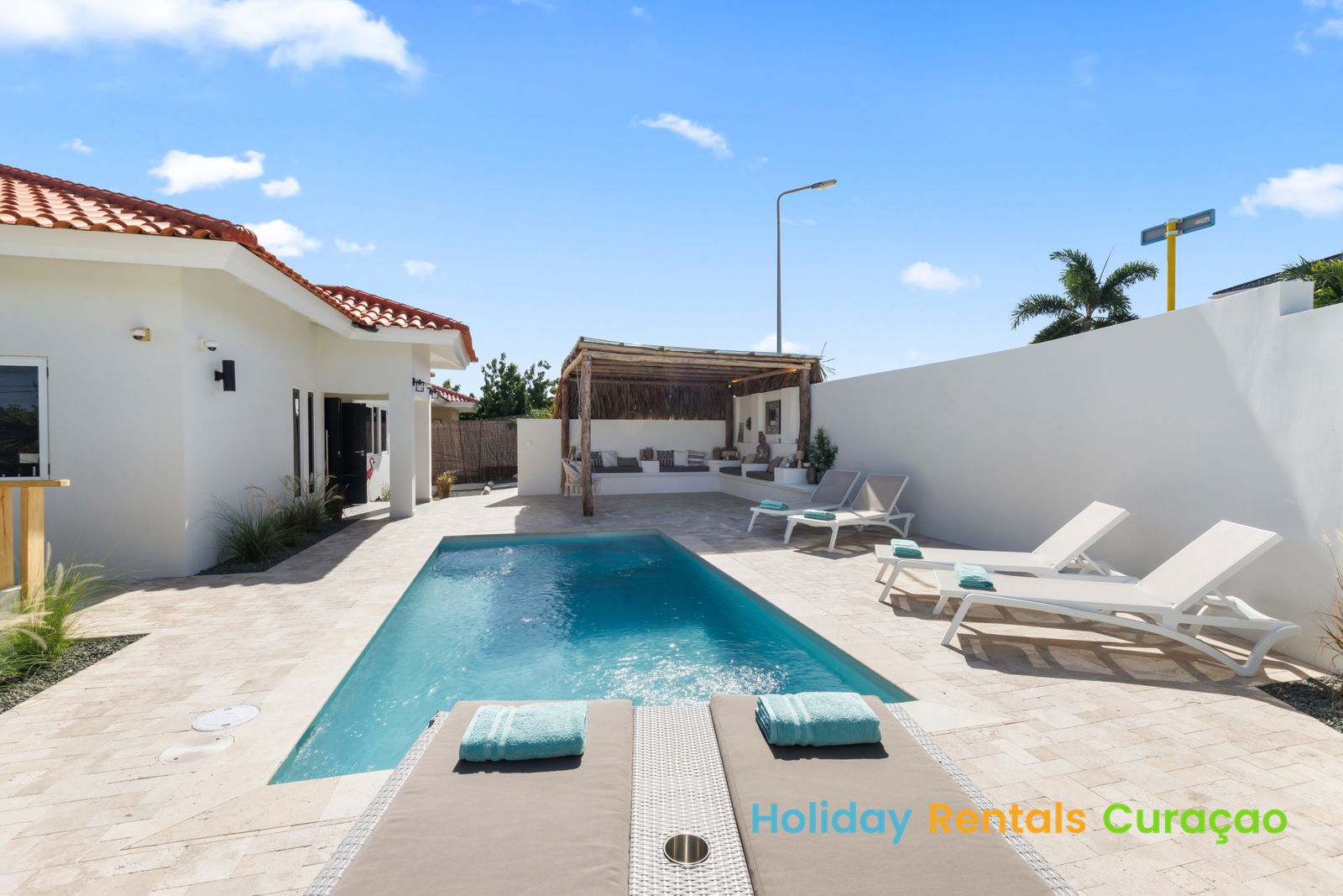 • Außenbereich: Privater Swimmingpool, Sonnenliegen und mehrere Lounge-Bereiche.