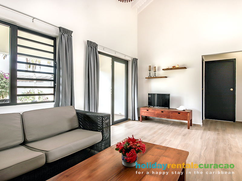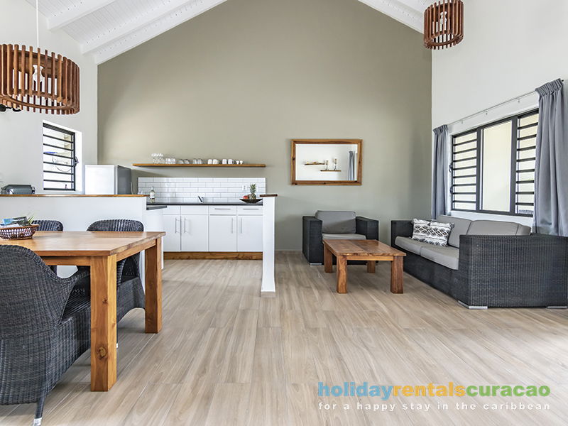 Es gibt ein Wohnzimmer mit offener, voll ausgestatteter Küche.