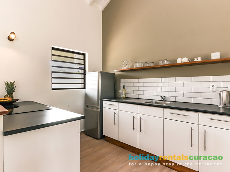 Die Küche verfügt über einen Backofen, ein Kochfeld, einen Kühlschrank, eine Kaffeemaschine und einen Wasserkocher.